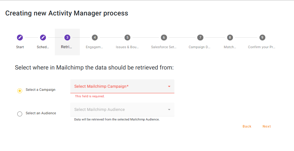 For Scheduled processes, we have limited Select a Campaign to just ‘List Campaigns’. We have done this because scheduled processes can run for years, yet a Mailchimp Campaign and subsequent ‘Activity’ campaign is likely only active for a couple of weeks at best. With this in mind, you might not wish to create a scheduled template that processes Opens and Clicks, but updates and existing List Campaign.