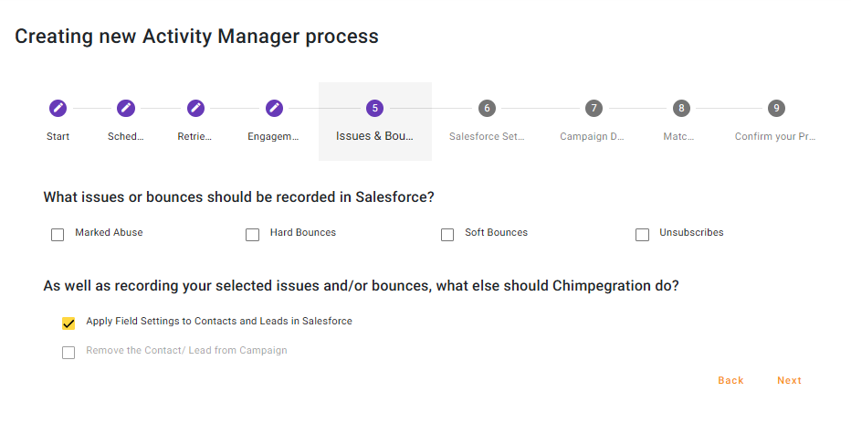 Select which issues or bounces should be retrieved and apply as an activity to a Salesforce Campaign. If you have populated the Contact and Lead Fields Setting, the Activity Manager process will apply the appropriate Picklist value to the Contact/Lead record by default. If you do not want to apply the Issue or Bounce to a Contact/Lead record, please uncheck ‘Apply Field Settings to Contact and leads in Salesforce’.