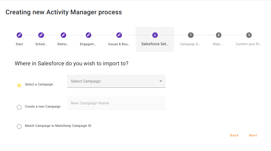 We have allowed users to Create a new Campaign which will create a Campaign in Salesforce during the processes’ first run, then use that same campaign in subsequent runs. However, we encourage the user to exercise caution when selecting this option.