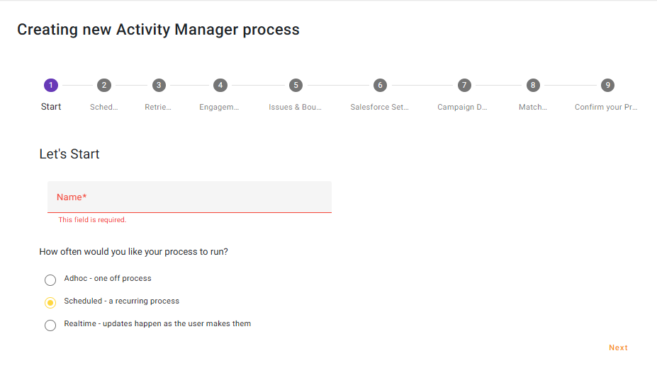 Give your process a name and choose ‘Scheduled – a recurring process’