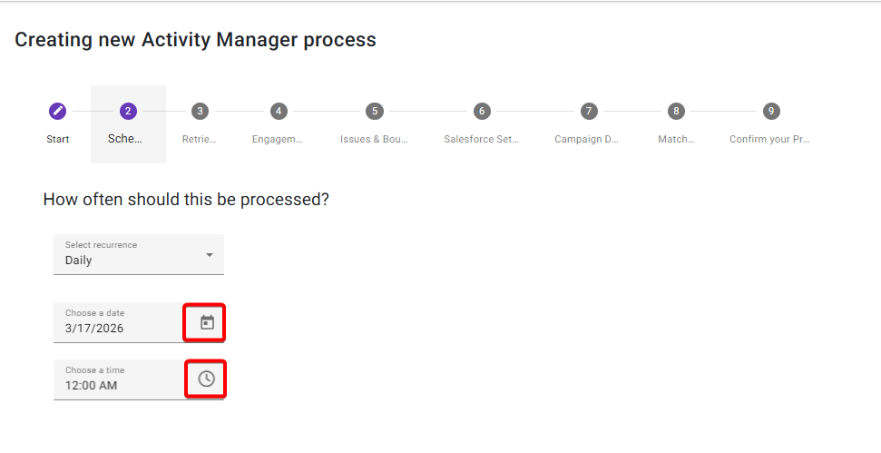 Select how often you want the process to run. Click on the Calendar icon to select a date and the Clock icon to select a time