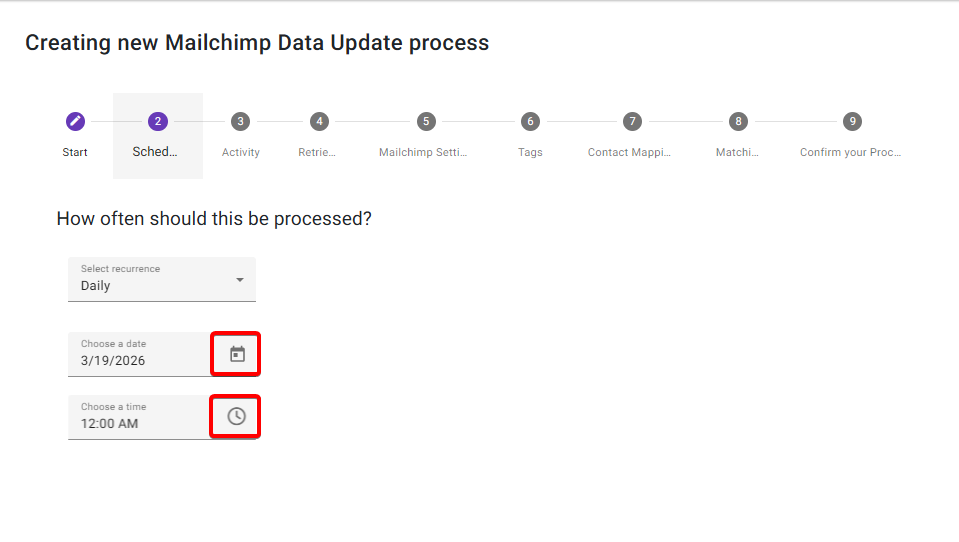 Select how often the process should run. Click on the Calendar icon to set the date and click on the Clock icon to set the time