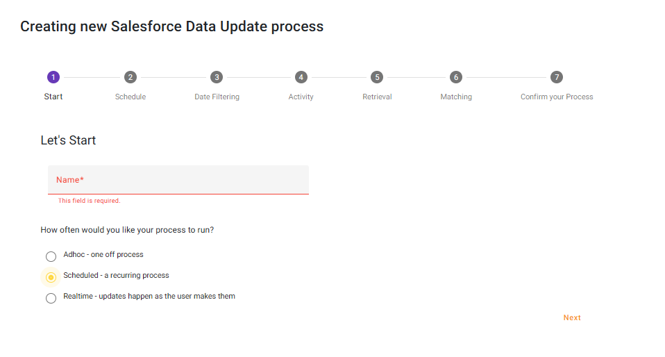 Give your process a name, then choose ‘Scheduled – a recurring process’