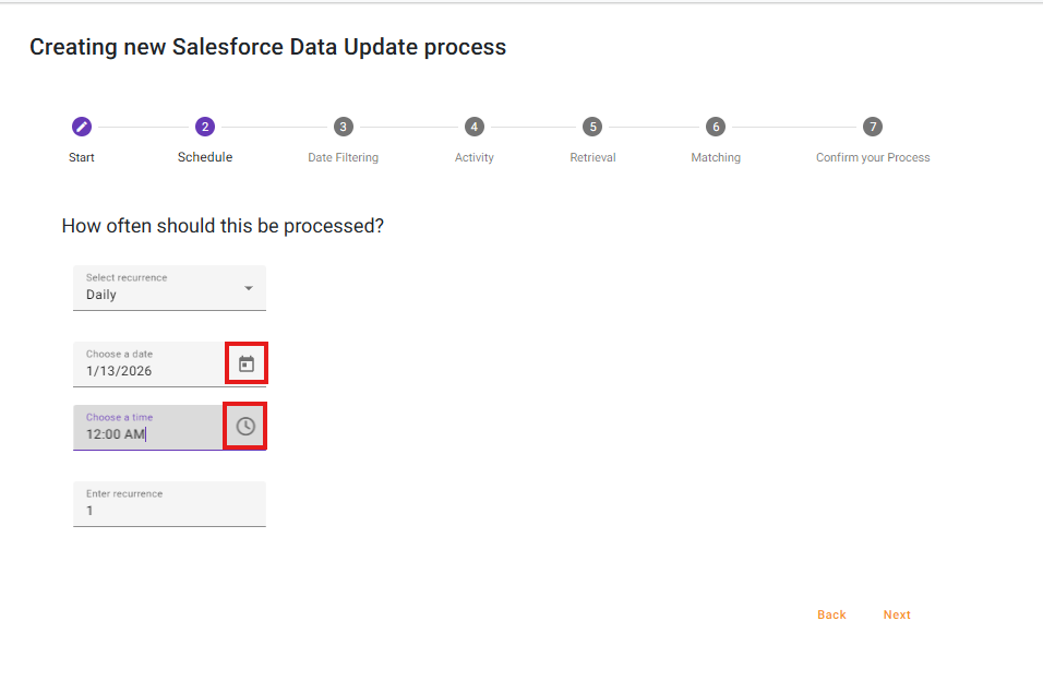 Set how often the process should run. Use the Calendar icon to help select a date and the clock icon to set the time