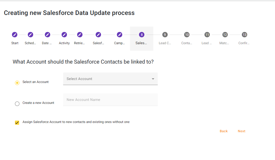 If you have chosen to Add or Update Contacts, tell Chimpegration which Account should be applied to Salesforce Contacts. You can use an Existing Account or create a new Account. By default, the option to assign a Salesforce Account to new contacts and existing ones without an Account is checked.