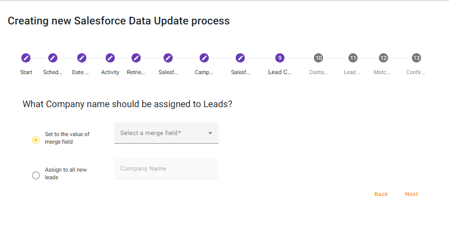 If you have chosen to Add or Update Leads, tell Chimpegration which Company should be applied to Salesforce Leads. You can use a value that was captured in a Merge Field in Mailchimp or create a new company that will be applied to all new Leads.