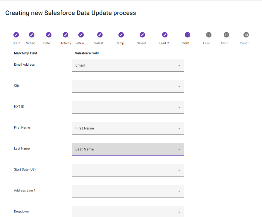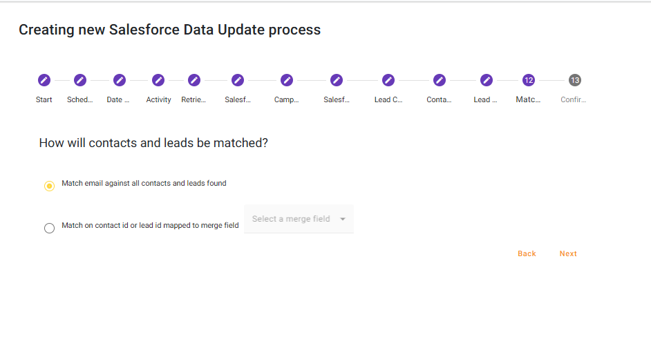 - ‘Match on contact id or lead ID mapped to the merge field’; select the Mailchimp field from the drop-down containing your Salesforce ID