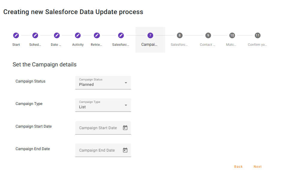 If ‘Select a Campaign’ or ‘Create a New Campaign’ was selected on the previous step, you will now need to consider the Campaign details as they will appear in Salesforce . Here you will also need to determine what the Campaign Type will be: List or Activity.