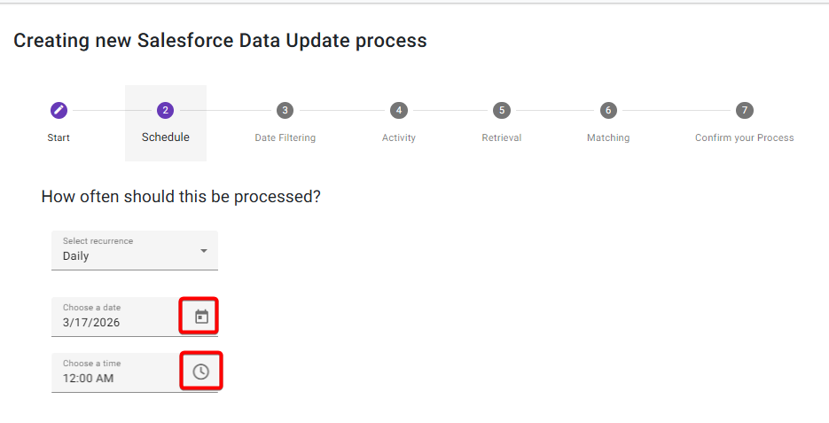 Set how often the process should run. Use the Calendar icon to help select a date and the clock icon to set the time