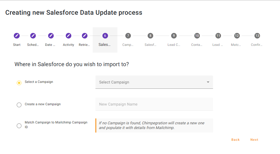 For Scheduled Processes, the option of ‘Match Campaign to Mailchimp Campaign ID’ may be the most useful as it will create a new ‘Activity’ Campaign in Salesforce for every Mailchimp Campaign sent out since the process last ran and populate it with every Contact and/or Lead that was sent the email.