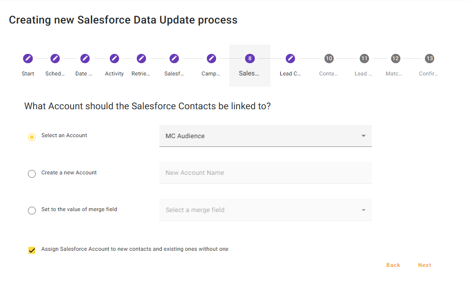 If you have chosen to Add or Update Contacts, tell Chimpegration which Account should be applied to Salesforce Contacts. You can use an Existing Account, create a new Account or Set to the Value of a Merge Field. By default, the option to assign a Salesforce Account to new contacts and existing ones without an Account is checked.
