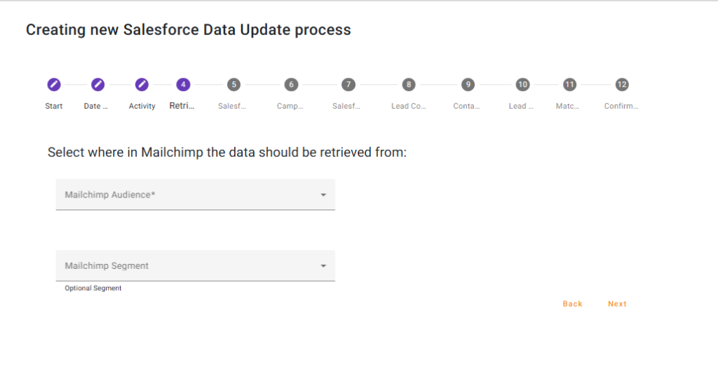 Select the Mailchimp Audience you want Chimpegration to retrieve data from. You can also narrow down which records to use by opting to select a Mailchimp segment present within that Audience.