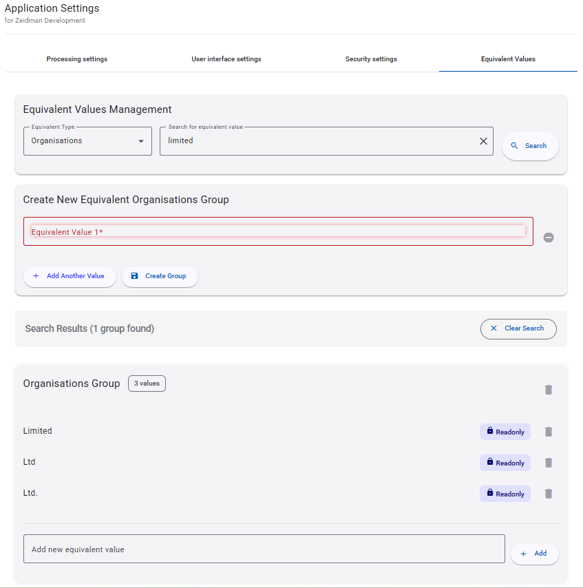 Equivalent Groups and Values provided by Zeidman Development are marked as ‘Read Only’