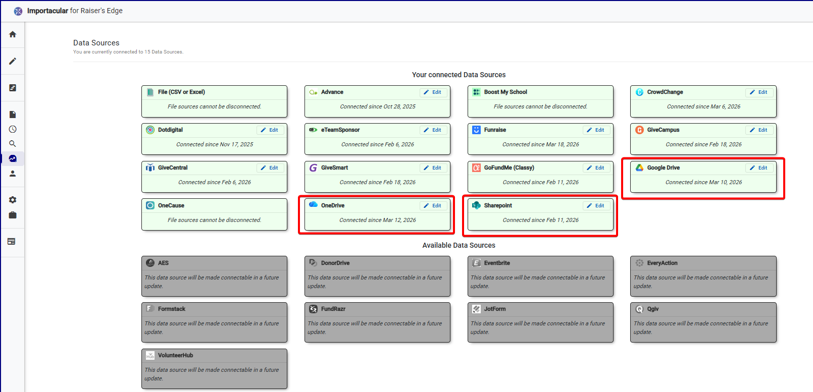 To automate your imports, you will need to use one of the file-based cloud storage Data Sources: Google Drive, One-Drive, and Sharepoint , and ensure that the files you seek to import automatically are either .csv, .xls or .xlsx files. How you choose to automatically add new files to these data sources is up to you. What Importacular NXT is offering is the ability to look in to a specific location within these data sources, at a specific recurring date and time, and pick up any files that meet the criteria that you stipulate and import the records from that file.
