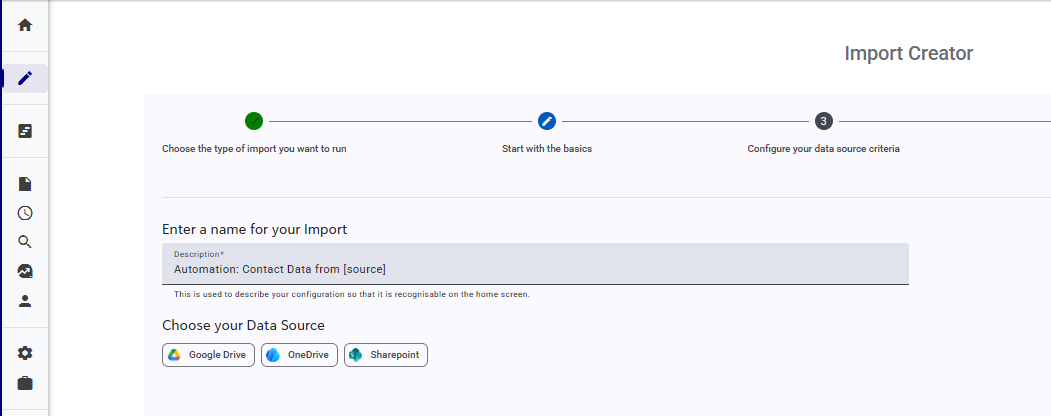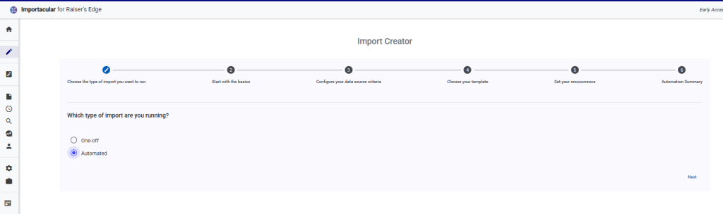 Once you have your template (and associated Record Lookups) in place for your desired Data Source, create a new Import. Within the Import Creator and select ‘Automated’ for the type of import.