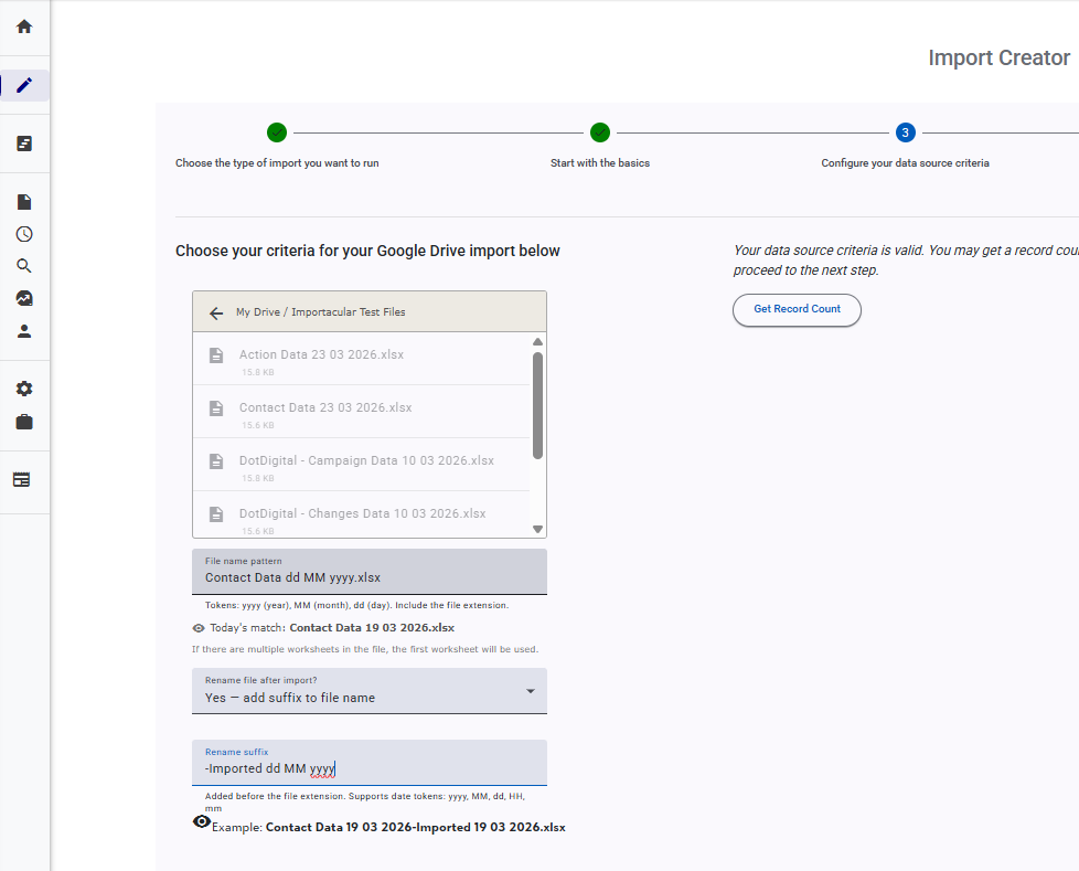You can also apply a suffix to the file after it has been imported to ensure that the same file is not picked up again when the Automation reruns. This Rename Suffix will accept date and time tokens of dd (day), MM (month), yyyy (year), HH (24 hour), and mm (minute).