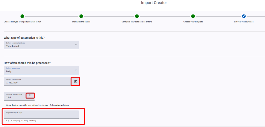 For ‘Daily’ Automations, we have also given you some extra flexibility by being able to staggering your process by offering to ‘Repeat every x days’. By default, it is set to repeat every 1 day, but you can change this to any whole number. For example, setting it to 3 will result in the ‘Daily’ Automation running every 3 days.