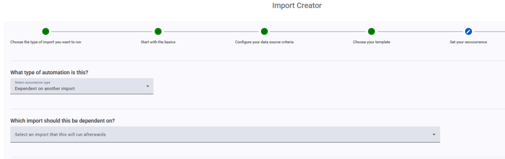 If you select ‘Dependant on another import’, you will be given an option to select another Automation. This means your Automation will not start until the Automation Import selected has completed its import.