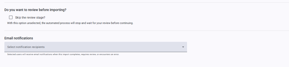 You can choose to skip the review stage. If you do so, records will be added and updated as per your template and Record Lookups, but any ‘Decides’ will be ignored for you to manage after the import has completed. Ignores and Exceptions will be handled as normal.