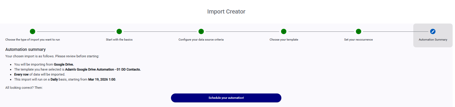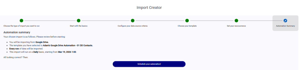 Finally, review your Automation import and click on ‘Schedule your automation!’ to activate it.