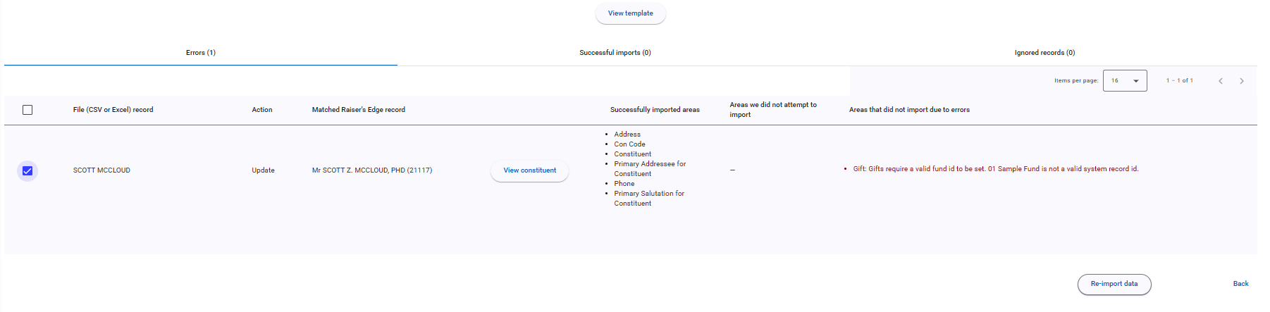 For records marked as Errors or Ignores, users can select them. When they do, the option to ‘re-import’ becomes selectable.