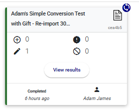 Once an Import has finished, the Import Card will move to the ‘Completed Cards’ section of the Dashboard. This card will contain a summary of the import as well as a button to review the ‘results’.
