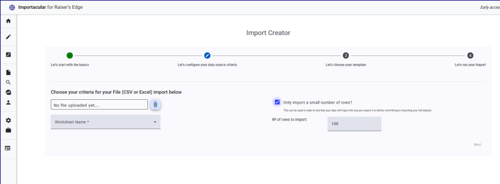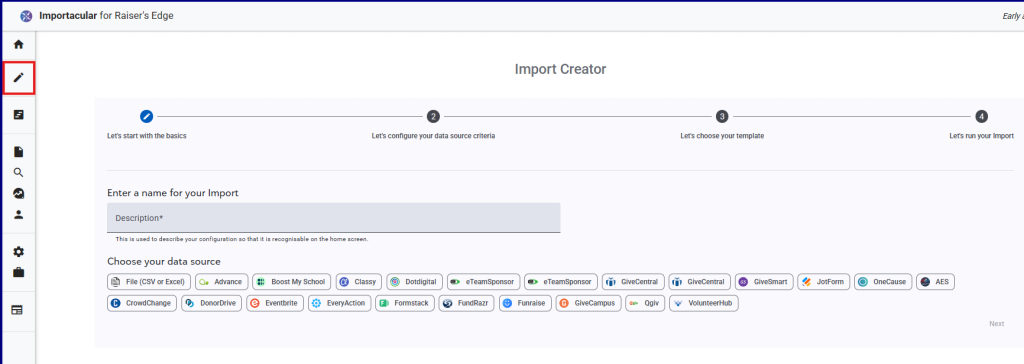 The Import Creator can be found by clicking on the pencil icon on the left-hand menu or the New Import button on the Dashboard. From here, give the import a name. The name will appear on the cards in the Dashboard, so try and apply a sensible naming convention. Next, choose the source for your data.