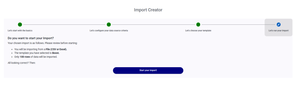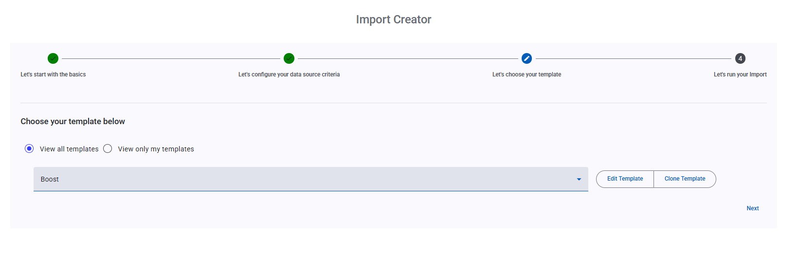 When you build or edit your template via the Template Manager, you are given an option to continue on to the Import Creator. In this scenario, the Import Name will be pre-populated with the Template name (we recommend you adjust this according to your naming convention). The data used to build your template will also be pre-populated along with the template itself.