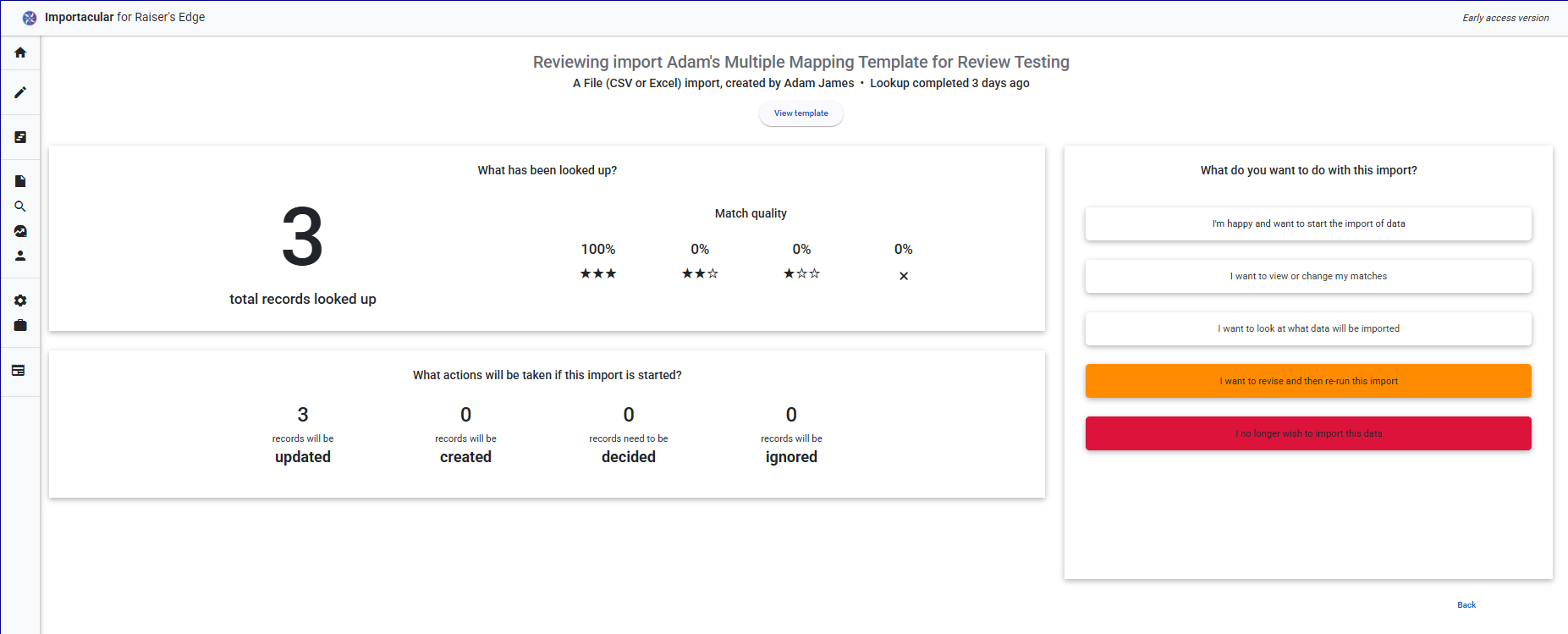 Clicking here will cancel the current import and return you to a pre-populated Import Creator for you to make revisions to incoming data ( such as different data source or more records) or revisions to the template including selecting a different template. If you wish to revise the Record Lookup, do so via the Template.