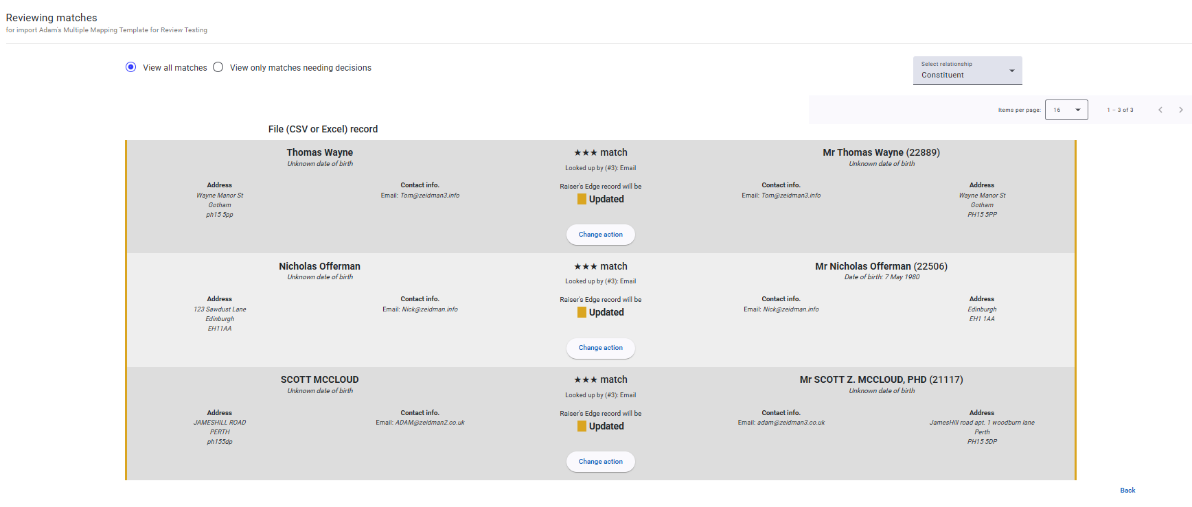 Click here to review, change and confirm matched records. If you wish to make an adjustment to the matches, click on the ‘Change Action’ button and review your options.