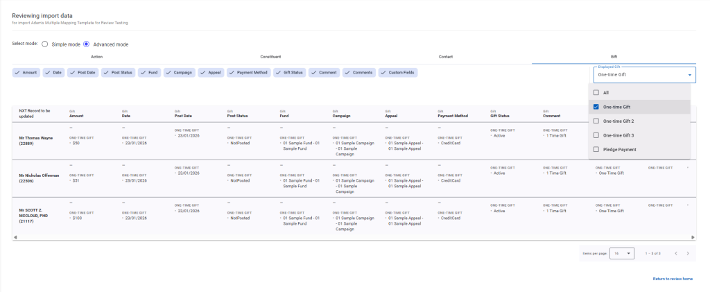 Where there a multiple Area Specific mappings, such as multiple Gifts or Actions, users can toggle which of the multiple Areas they want to see
