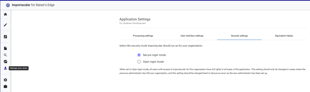 Once Importacular NXT has been set to ‘Secure Login Mode’, via the Settings/Security Settings, head over to ‘Manage your users’: