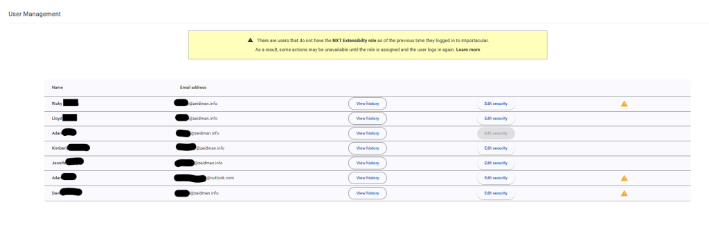 For users that have not been extended an Extensibility role are highlighted with an orange triangle icon. Click here to find out how to manage Extensibility Roles in RE NXT